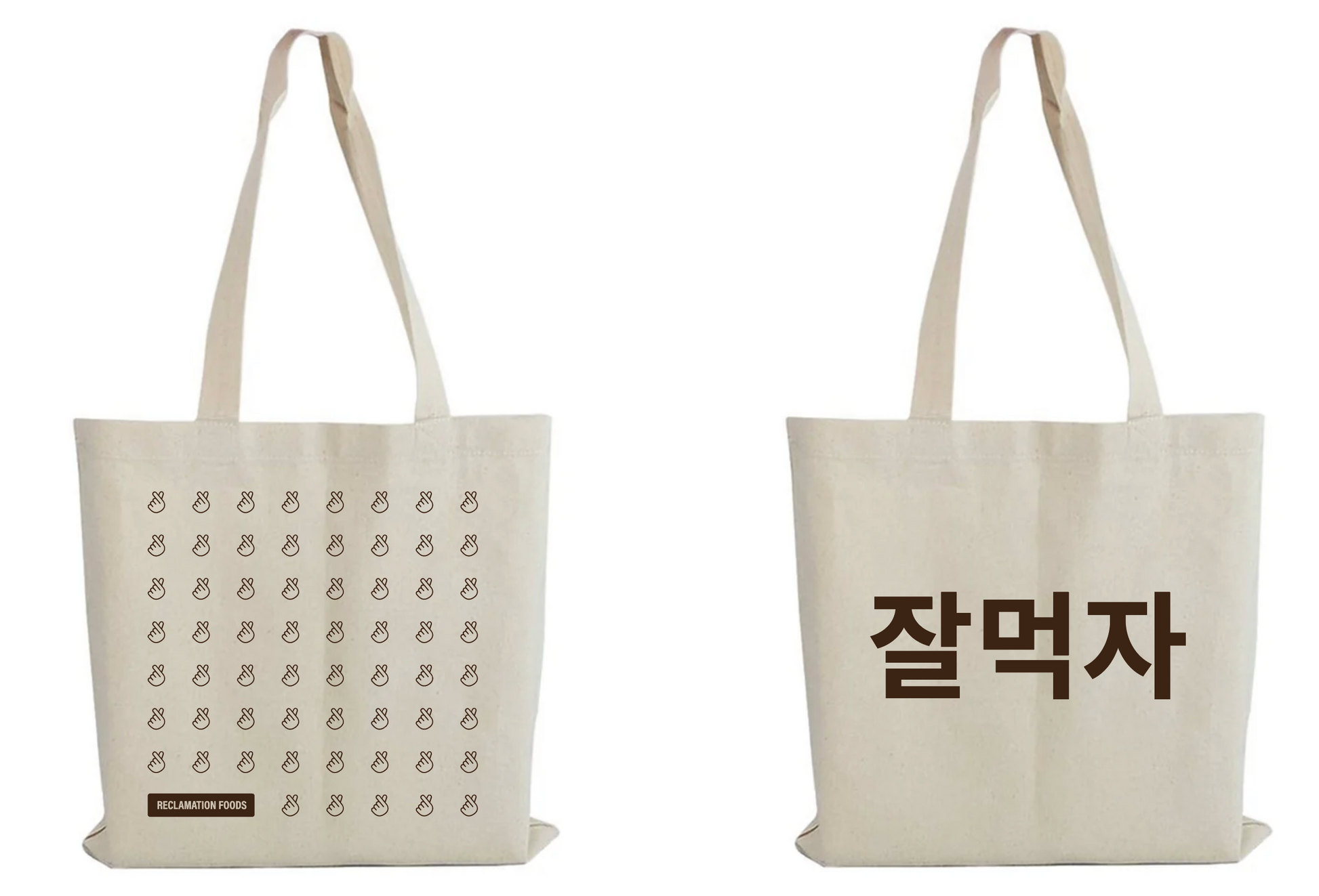 Our eco-friendly canvas tote bag features a Korean fingerheart pattern on one side and "Let's eat well" in hangul (Korean written language) on the other. The perfect size for grocery shopping, a stroll in the park, or whatever your weekend brings.